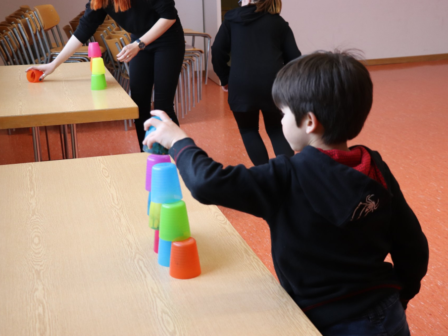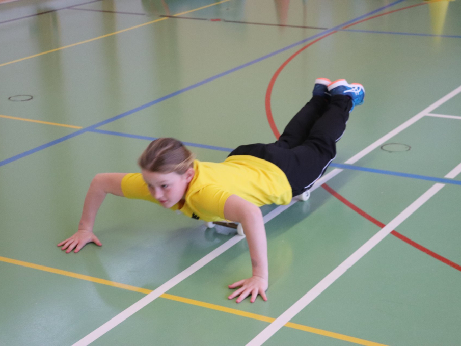In altersdurchmischten Gruppen von den Kleinsten bis zu den Schülerinnen und Schülern der 6. Klassen zogen die Gruppen von Sportwettkampf zu Sportwettkampf und massen sich mit einer anderen Gruppe. Da gab es, wie es an der Winterolympiade üblich ist, Wettkämpfe im Biathlon (Rutschen auf Teppichmatten und Becherschiessen), Skicross (Hindernislauf in der Turnhalle), Schanzenspringen (Sprung vom Kasten auf das Minitramp in die Matten) Rodeln (Strecke auf dem Rollbrett liegend zurücklegen und zurück), Bobfahren (auf der Matte die Treppe runter rutschen), usw.
