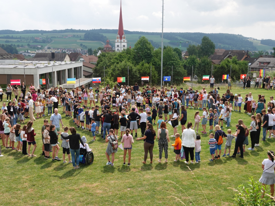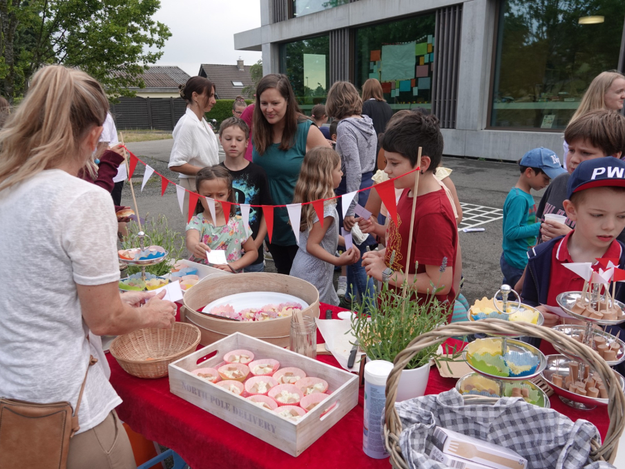 Dank der Mitarbeit vieler Eltern konnte man sich am Freitag auch noch durch alle Spezialitäten der Länder essen, aus denen unsere Kinder kommen. Ein wahres Geschenk dieser vielen Helfer und Helferinnen aus den verschiedenen Nationalitäten, die uns diese kulinarische Weltreise ermöglicht haben. Zum Projekt-Abschluss tanzten wir nochmals alle miteinander „Zäme um d‘Wält“ und jedes Kind hängte seinen Wimpel, welcher es in dieser Woche gebastelt hat, an den Zaun des Fussballplatzes.