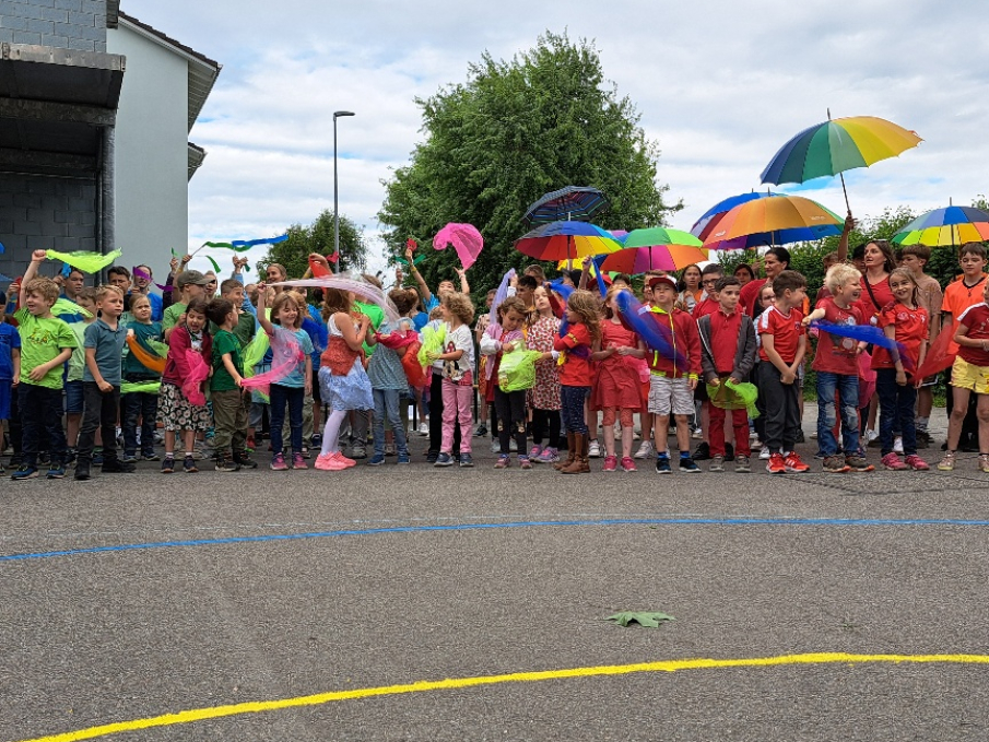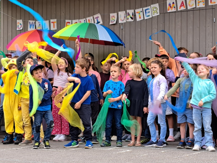 Passend zu unserem diesjährigen Jahresthema «D"Wält echli bonter mache» ging es an unserem Schulschlussfest am Donnerstagabend, 6.Juni 2024 farbig zu und her. Die farbige Kinderschar startete das Fest mit dem gemeinsamen Lied «Rägebogebont». Die Farbenpracht war gross, denn mit farbigen Tücher und Bänder, ja sogar Regenbogenschirmen unterstützten die Kinder den Gesang schwungvoll. Mit Ukelen begleitet, trugen danach die Kinder der 5./6.Klasse ihr Lied «Riptide» vor. Danach begrüsste unser Schulleiter Lui von Andrian unsere Gäste und dankte allen für das tolle Schuljahr.