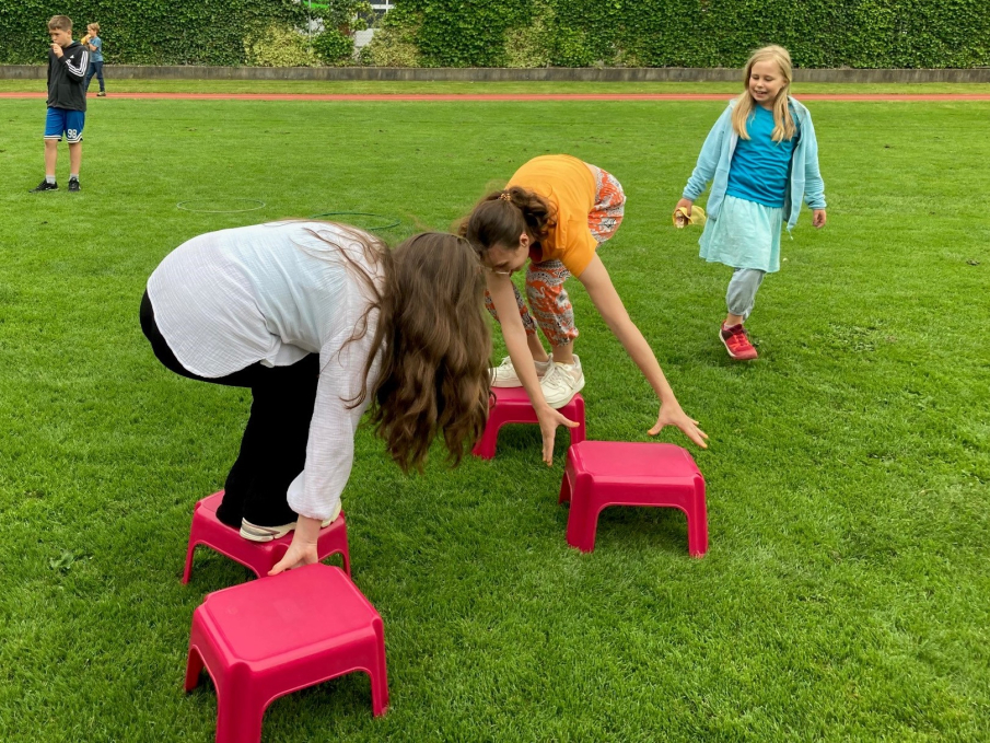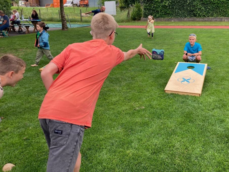 Während viele Eltern bei Speis und Trank Gelegenheit hatten sich in Gespräche zu vertiefen, hatten die Kinder die Möglichkeit die verschiedenen Ateliers zu entdecken. Der Traktorparcour begeisterte nicht nur die kleinen Gäste. Wegen dem windigen Wetter gelang es den Kindern besonders gut grosse Seifenblasen entstehen zu lassen. Es wurde im Windgeschützten Uno gespielt, mit Farben und Kreiden gemalt und mit dem farbigen Riesenschwungtuch gespielt. Beim Rasenplatz war der Gwunder über das Wurfspiel Cornhole gross. Da konnte sich Spielfreudige in der Technik des Maissäckewerfens messen.