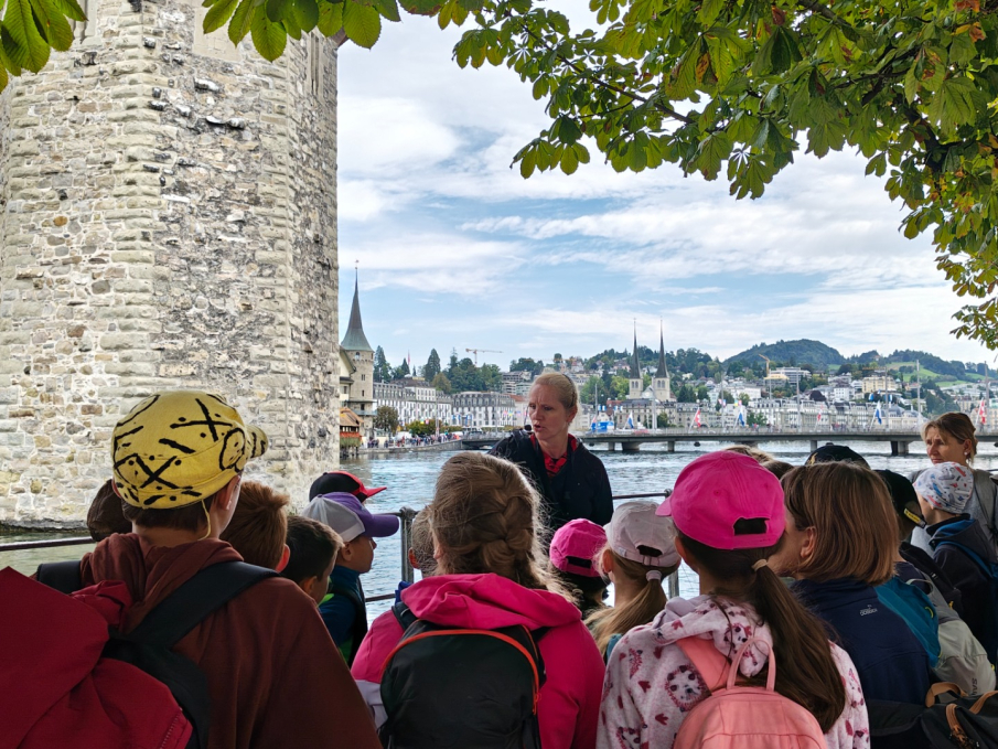 Wir haben die Kapellbrücke besichtigt, die Hofkirche von Weitem angeschaut und sind anschliessend zum Brunnen beim Kornmarkt spaziert. Dort erfuhren wir etwas über die Luzerner Fasnacht und den Morgenstreich! Sie hat «Brüele» gerufen, was so viel heisst wie schreien. Dies wird am Morgen an der Fasnacht auch gemacht. Von der Orangenschlacht und dem Konfettiregen hat sie uns auch erzählt. Dann ging es weiter. Nach dem Rathaus sind wir zur Museggmauer hochgewandert.