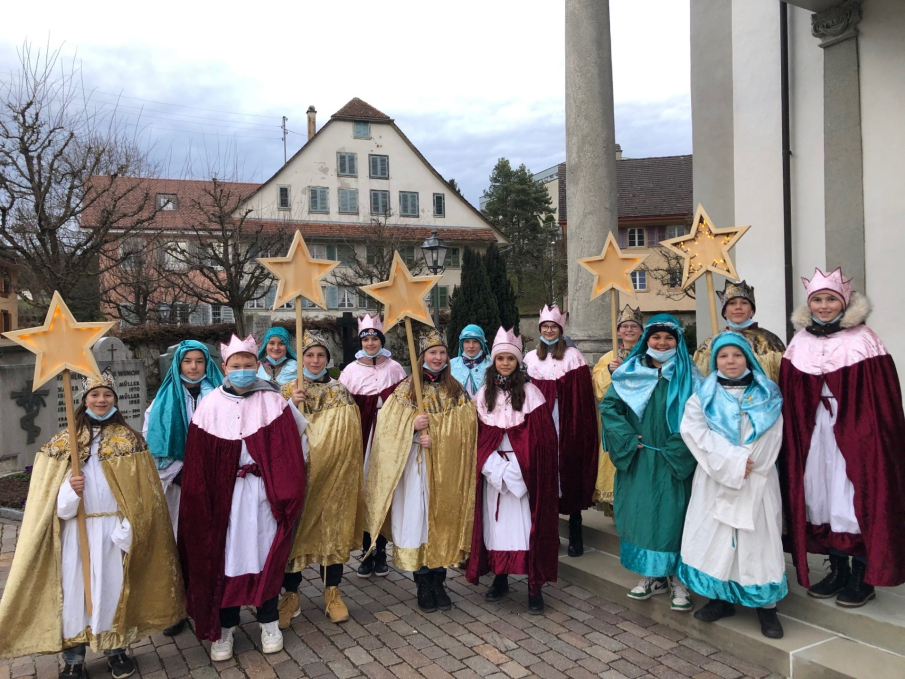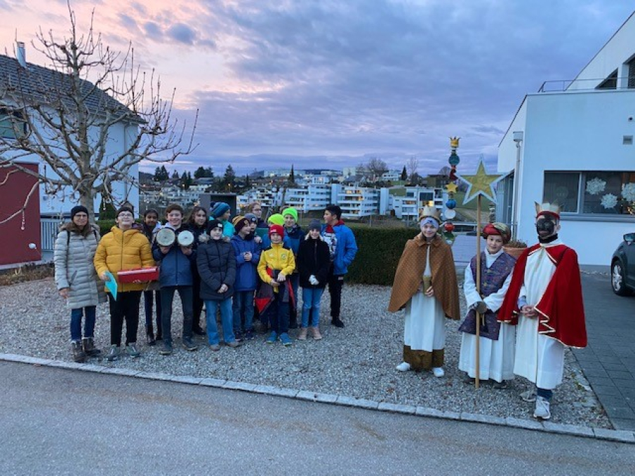 Anschliessend erfreuten die einzelnen Klassen mit ihrem Gesang und den Sprüchen der 3 Könige die Zuhörerinnen und Zuhörer vor ihren Häusern oder auf den Plätzen.